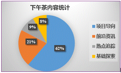 “下午茶”内容主要以项目需求为导向,强调“寓教于研”,使研究生能够发现项目中遇到的科学问题,并以“下午茶”为契机,探索与解决项目中科研问题;前沿资讯主要是介绍最新最前沿的科技动态,达到碰撞思维火花、点燃智慧火焰的目的;热点追踪是“下午茶”的重要组成部分,主要解决科研热点的“5W”问题,即“What Why Who When Where”,实现对于现科研热点整个发展脉络的深入理解;基础探索也是“下午茶” 中不可或缺的一部分,主要培养研究生的科研基础知识,做到“万丈高楼平地起”。