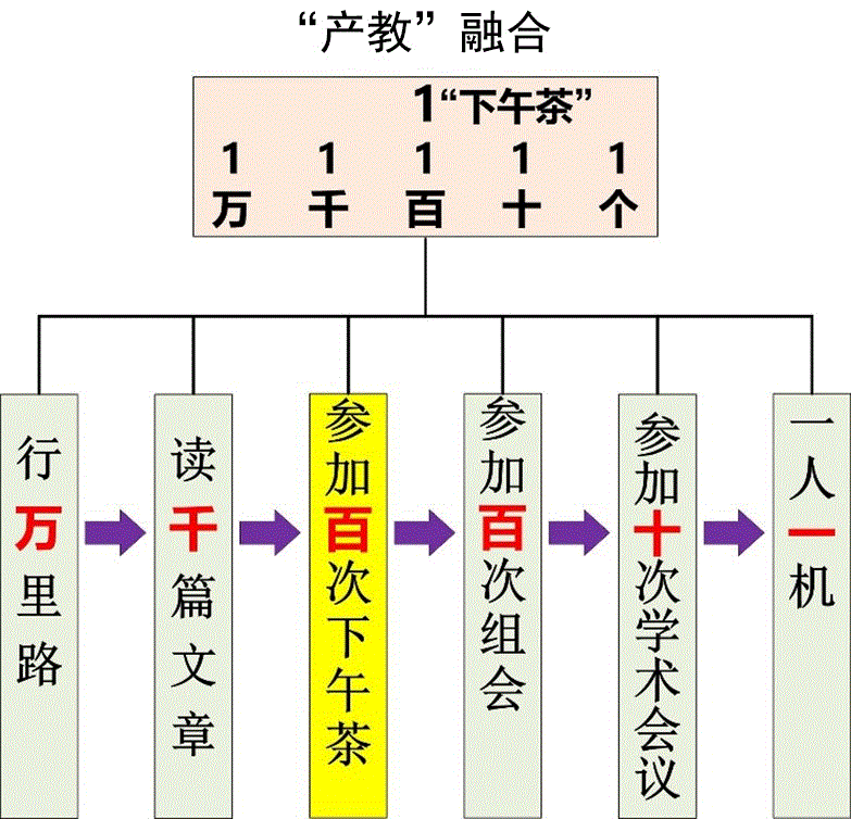 六个“一”是前沿院所主导的“产教”融合研究生的培养模式。通过行万里路的产业调研,辅以千篇文献的学习阅读,再加上参与百次下午茶和百次组会的研究生核心培养方式,结合参加十次学术会议学业历程,最终达成一人一机的成果,实现“产教”融合、交叉型科技创新、高质量人才的培养。